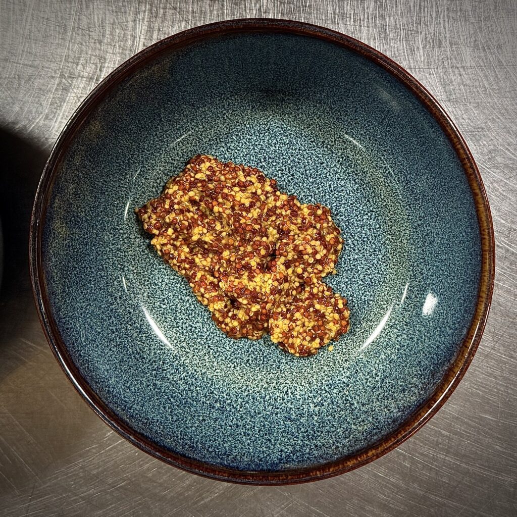 * En un recipiente pequeño, mezclar la mostaza Dijon antigua y el papelón rallado.