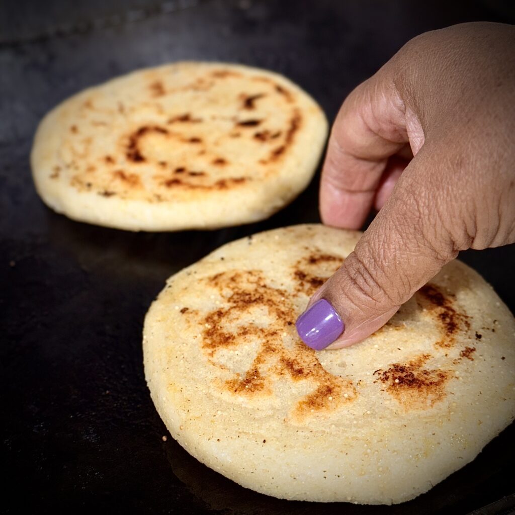 * En un budare o plancha a temperatura media, hacer 2 arepas de 170 grs cada una. Colocar en la plancha hasta que, al golpearlas suavemente, suenen «toc toc». ¡Así le enseñó su mamá!