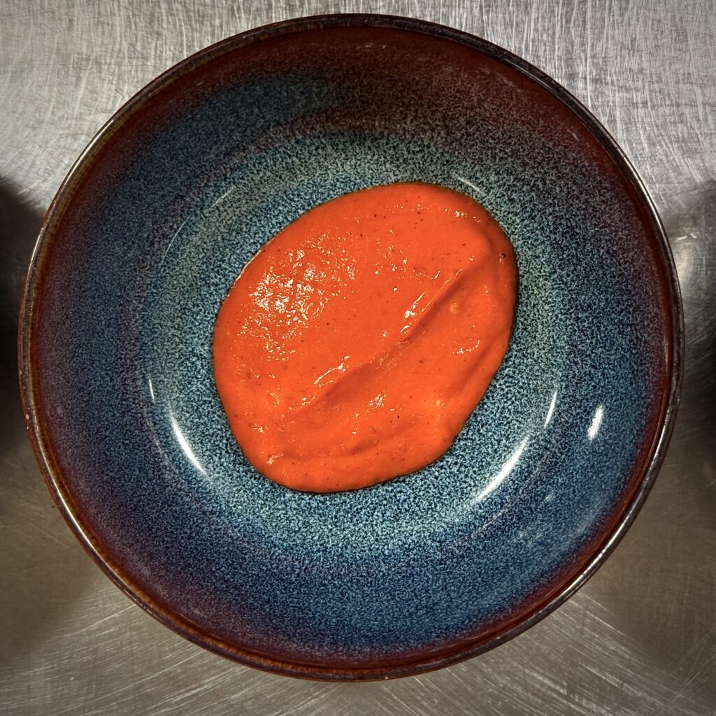* Para la salsa de ají dulce: En un sartén, colocar el aceite a temperatura media. Añadir el ají dulce, ajo, sal y pimienta. Dorar todos los ingredientes. Aún calientes, llevar a un procesador o licuadora. Licuar hasta obtener una salsa homogénea y espesa. Rectificar sal y pimienta.