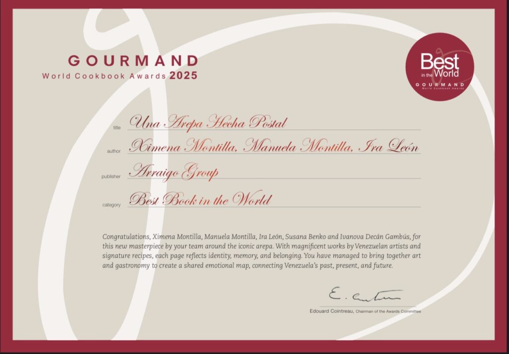 - Nuestros libros son galardonados en los Gourmand Awards y «Una Arepa para el Futuro» recibe el premio especial de 30 años y «Una arepa hecha postal» gana mejor de lo mejor 2025