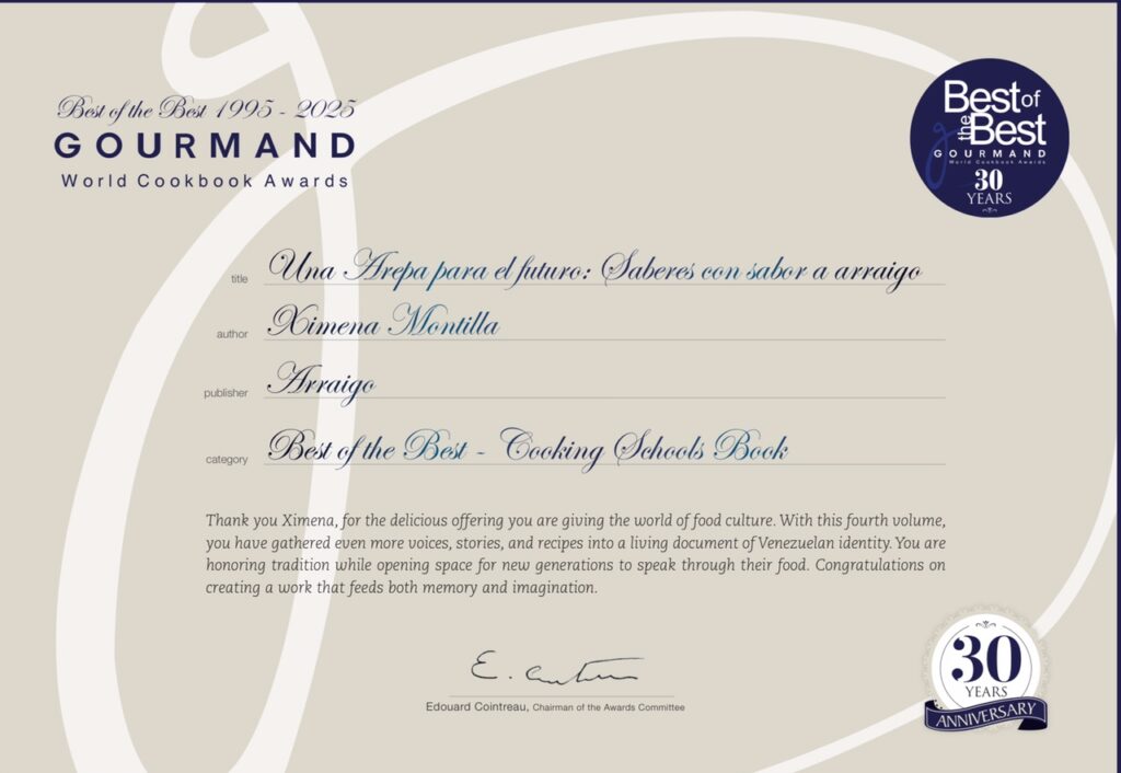 Este es quizás el reconocimiento más trascendental que ha recibido el proyecto Historia de la Arepa hasta la fecha. En el marco del 30º aniversario de los Gourmand Awards, nuestro libro «Una Arepa para el Futuro» ha sido seleccionado como el Mejor Libro sobre Escuelas de Cocina en la historia de los premios.