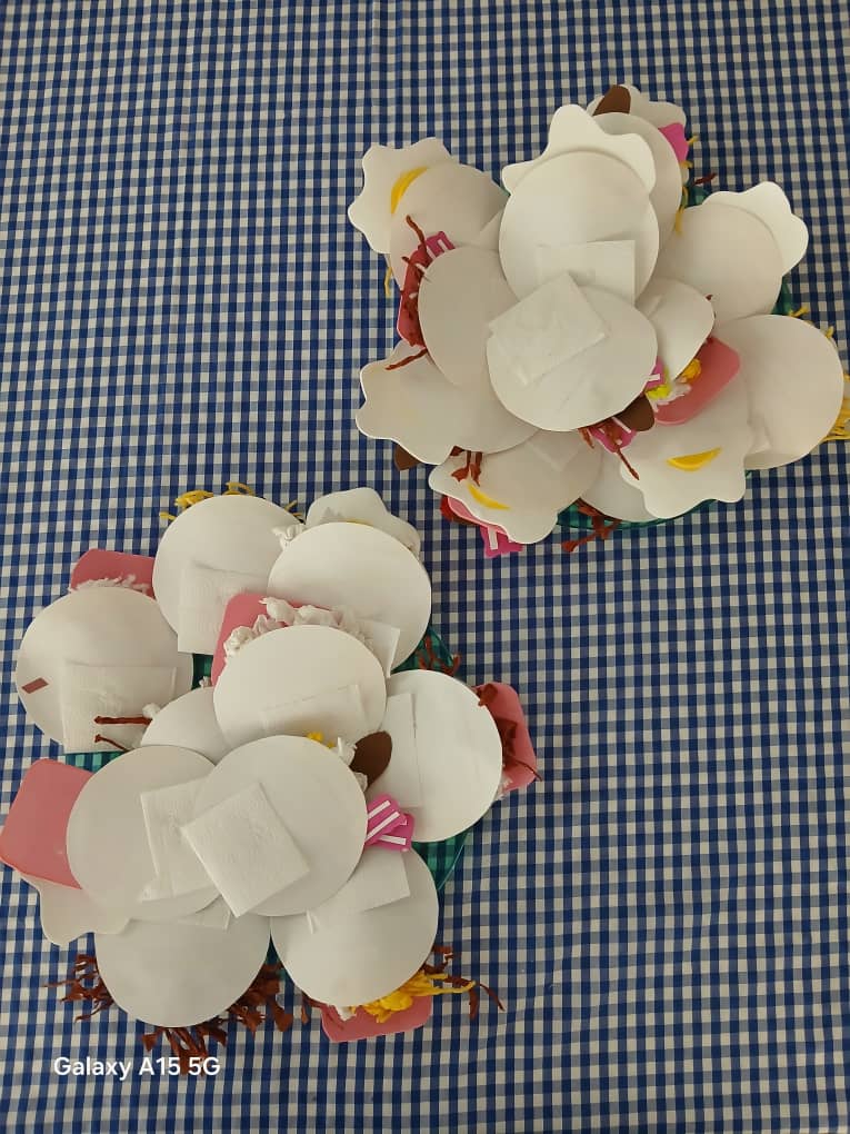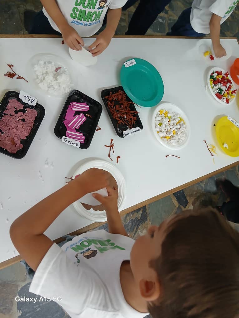 Utilizando materiales reciclados, los niños crearon sus propias versiones de arepas, «rellenándolas» con retazos que representaban queso rallado, caraotas y huevos revueltos.